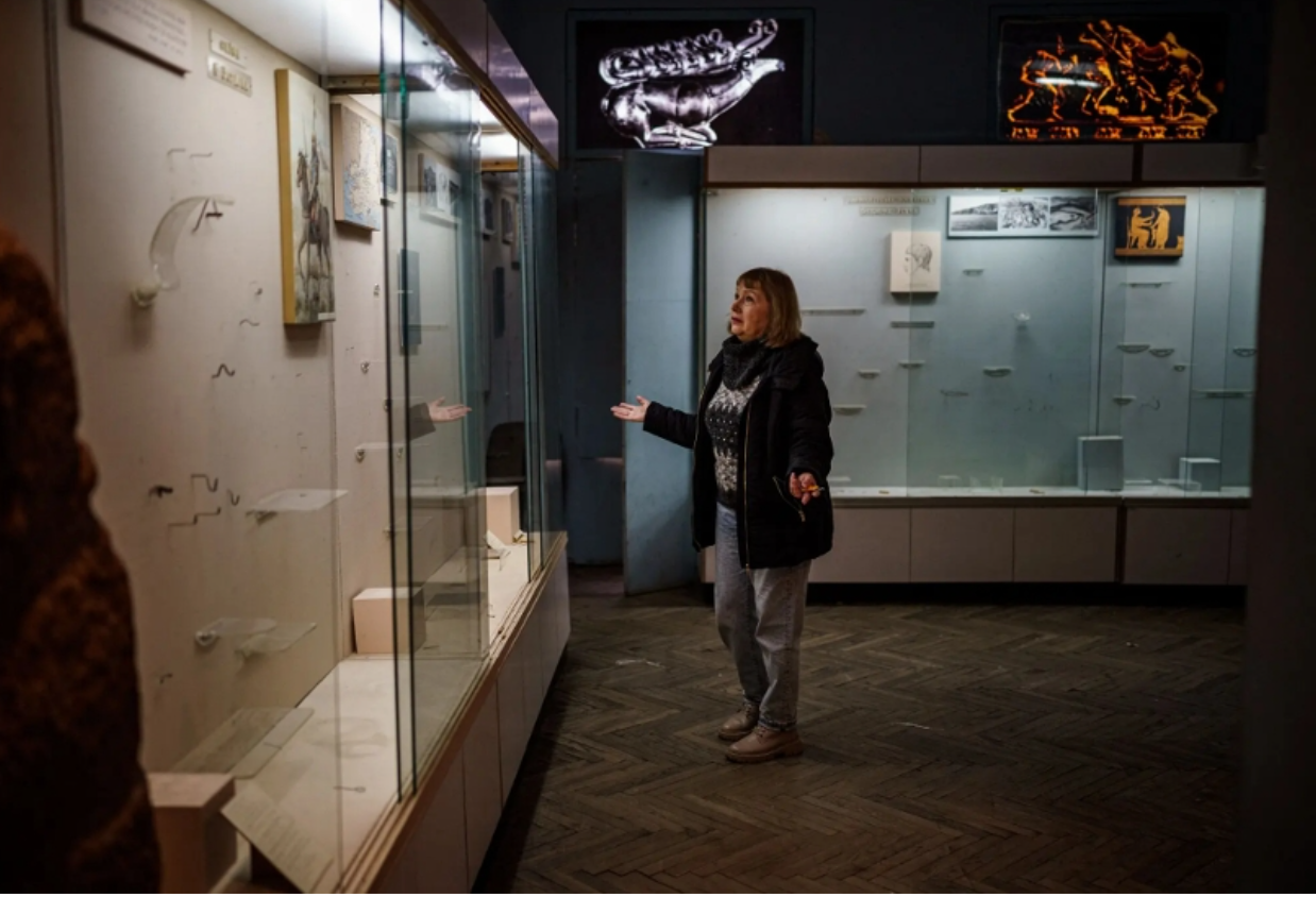 Olga Honcharova, temporary director of the Kherson Regional Museum, shows empty glass display cases in Kherson ~New York Times
