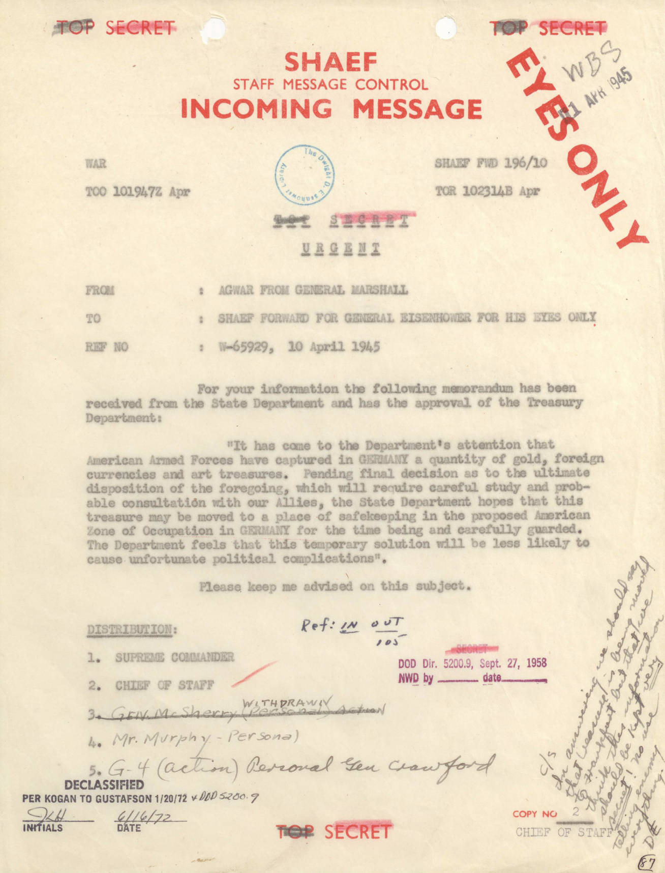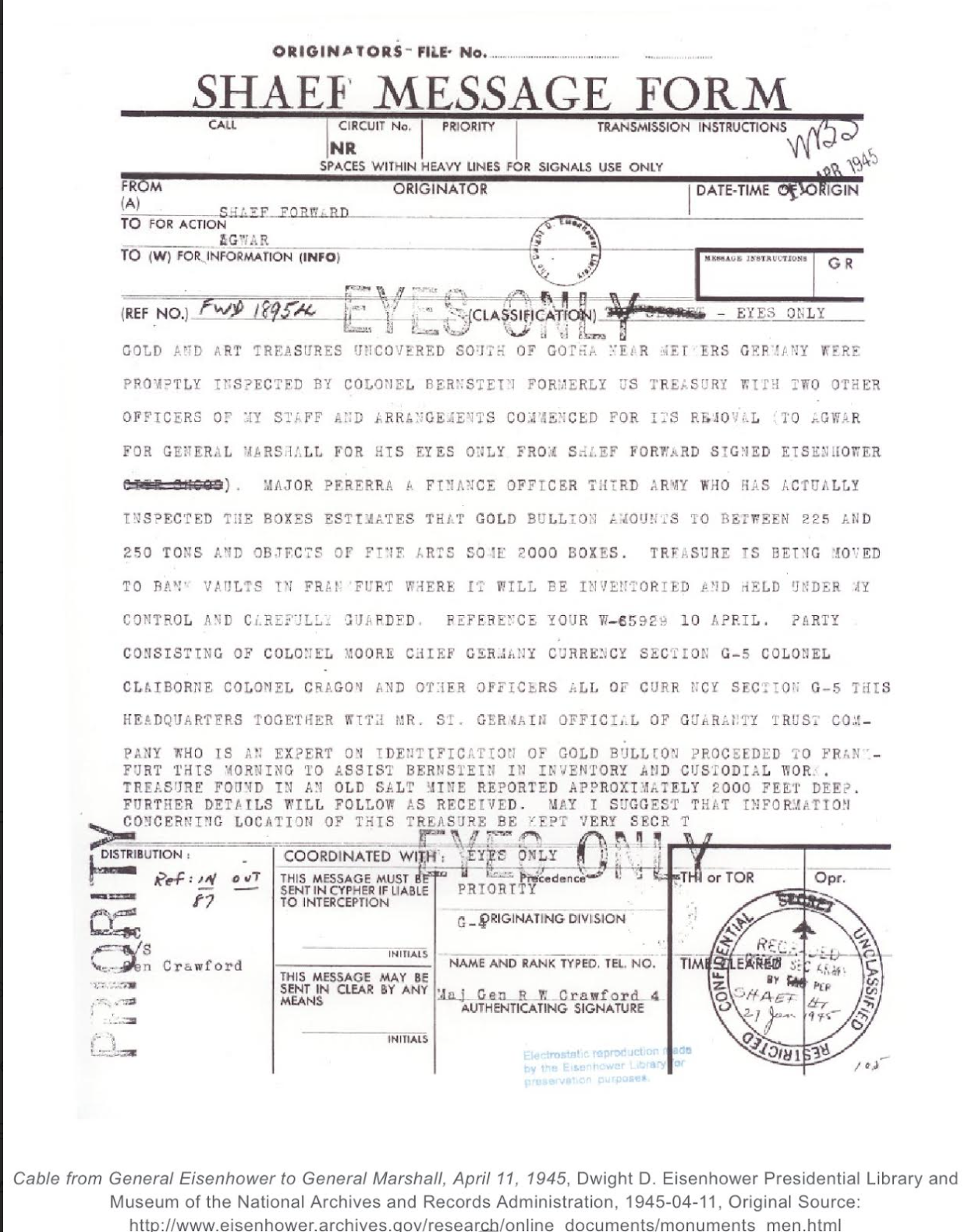 "Three hundred and forty-five men and women from thirteen countries spent 1945 canvassing over 1,000 troves containing an estimated 5 million pieces of artwork and cultural items stolen from wealthy Jews, museums, universities, and religious institutions.”